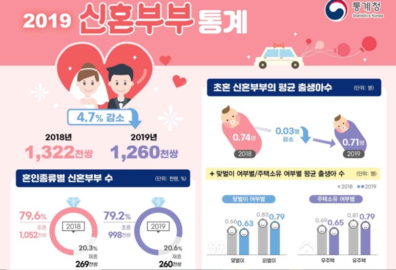 이에 더하여 2020년 12월 통계청에서 발표한 2019년 신혼부부통계를 보면 전년 비 4.7% 감소 된것으로 확인되고,