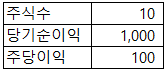 주식수가 10주이고, 당기순이익이 1,000원이라면 주당이익은 100원이 됩니다.