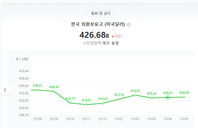 52. 2022년초만 하더라도 4,600억 불이 넘던 외환보유고가 2023년 5월 4일 발표에는 4,266억 불까지 줄어들었죠